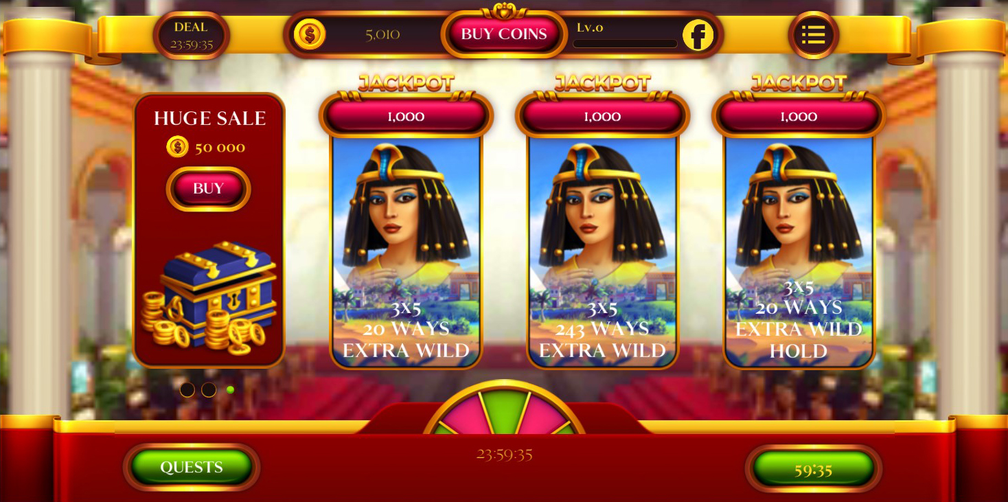 Free spins, Jackpot, Scatter, Bonus, and extra wheel of fortune spinner for free coins every 24 hours